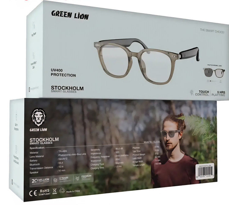 برند خوش نام green lion با تکیه بر دانش و تکنولوژی روز و با استفاده از متریال با کیفیت یکی از تولید کننده های برتر دنیا در زمینه گجت ها و لوازم جانبی کاربردی است یکی از محصولات خاص این کمپانی عینک هوشمند فوتوکرومیک مدل استکهلم میباشد که لنز های آن در شب روشن و در روز دودی میشود،چیزی که این عینک را خاص کرده است طراحی ارگونومیک بسیار شکیل و زیبا که در نگاه اول بنظر نمیرسد یک عینک هوشمند است و این را باید بخاطر دسته های باریک آن در نظر گرفت و همچنین قابلیت مکالمه و گوش دادن به موسیقی بدون اینکه چیزی در گوش شما وارد شود و موجب آزار شود و همچنین بخاطر همین مسئله باعث عدم قارچی شدن و خارش گوش میشود از قابلیت های شاخص این عینک هوشمند میتوان به دستیار صوتی و پنل کاربری بغل عینک لمسی و همچنین گواهی نظامی مقاومت در برابر پاشش آب دانست